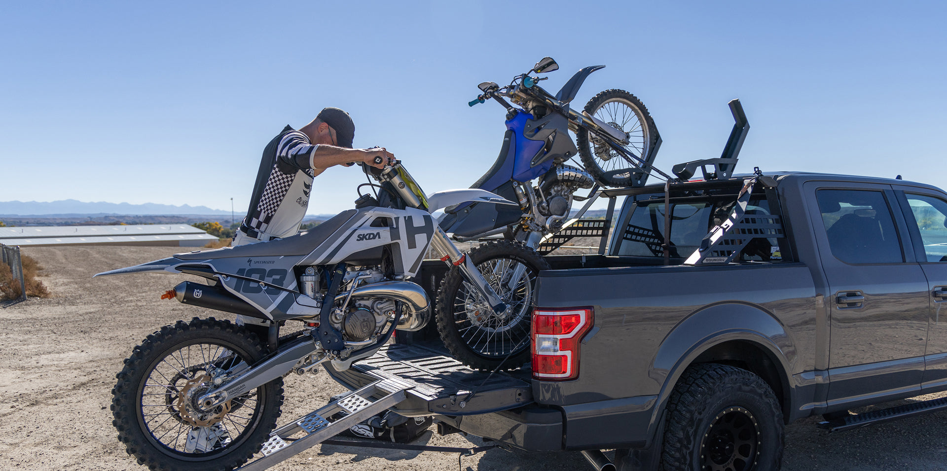 When making the Big Days rack, several dirt bikers asked us to “please make one that works with motorcycles”. It didn’t matter how difficult it was to get the bike into that position, they just wanted to be able to close their tailgates. In light of this, we recommend using two people to put the bike into the Moto Holder. First, turn off the fuel on the motorcycle. Then, using a ramp, get the bike into the bed of the truck. Once there: